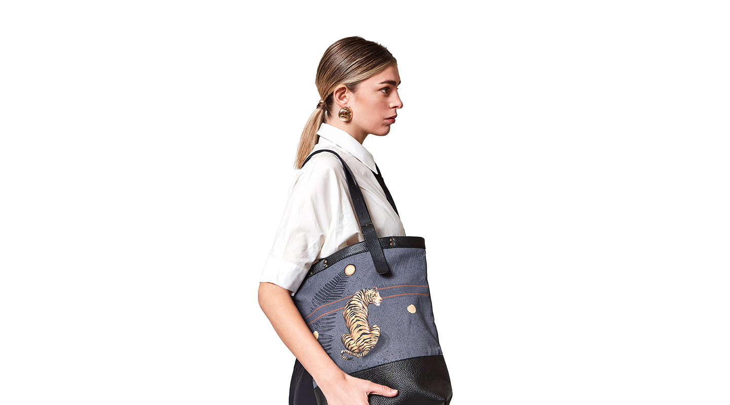 pelle bottalata e cotone stampato - manici realizzati in vacchetta vegetale e dotati di fibbie per regolarne la lunghezza, in modo da consentire l’utilizzo sia a spalla che a mano. - 26 x 38 x 10cm - Made in Italy