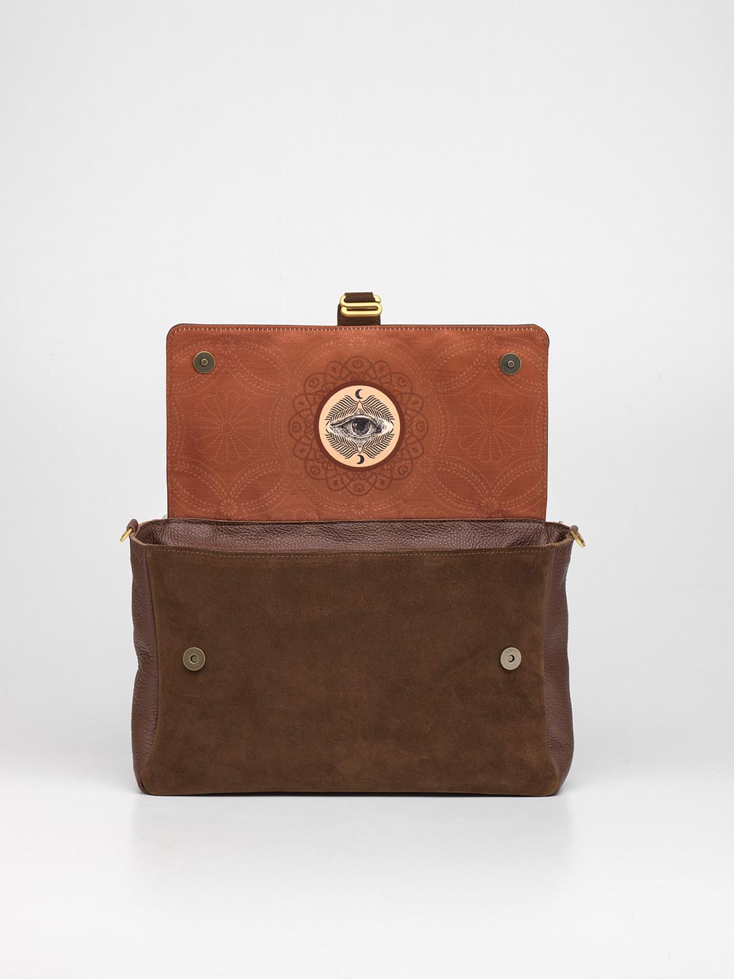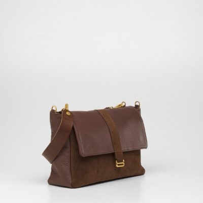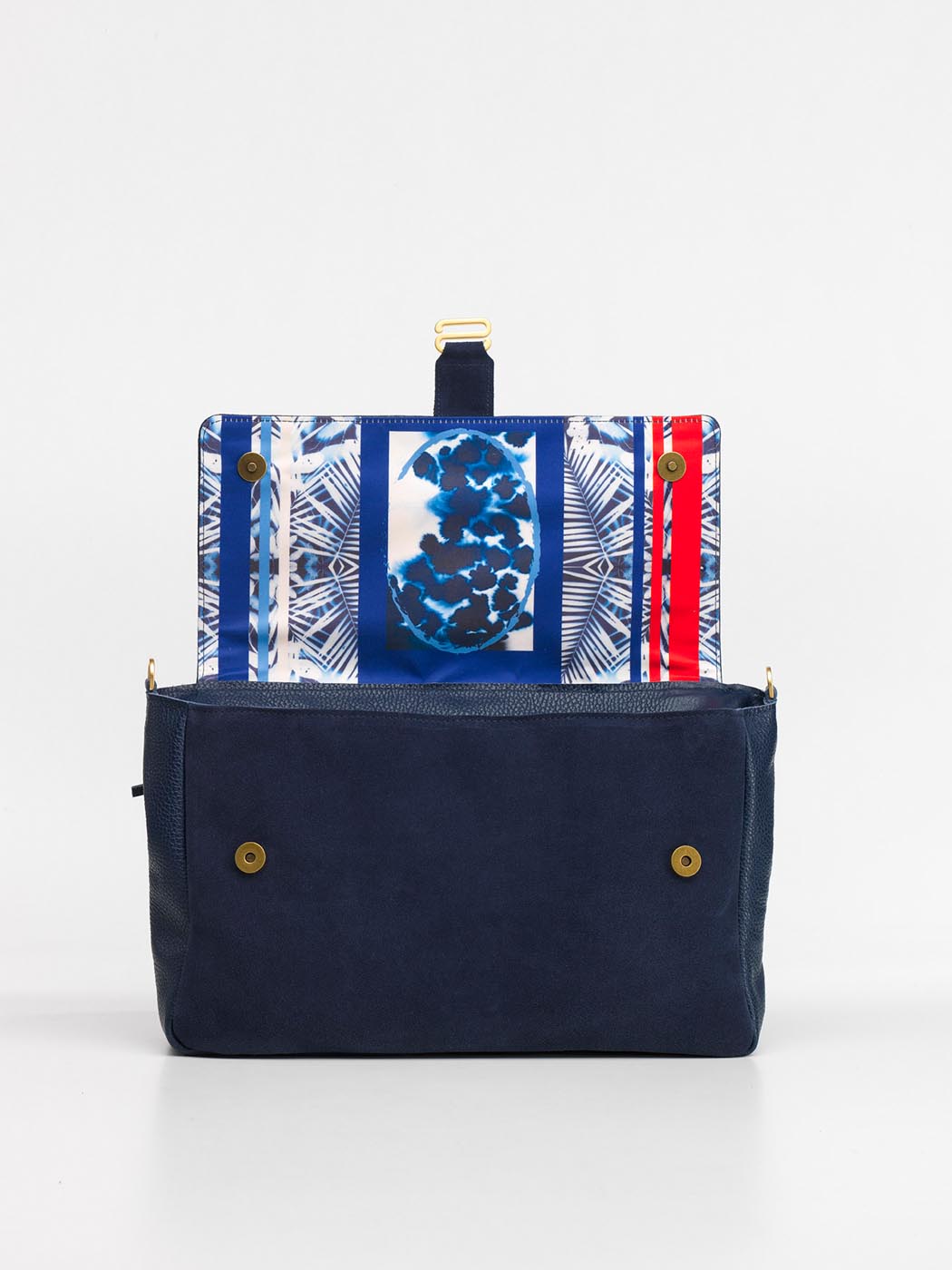 Chiusura: patta con doppio bottone magnetico, sistema di restringimento a mezzo moschettone all’interno