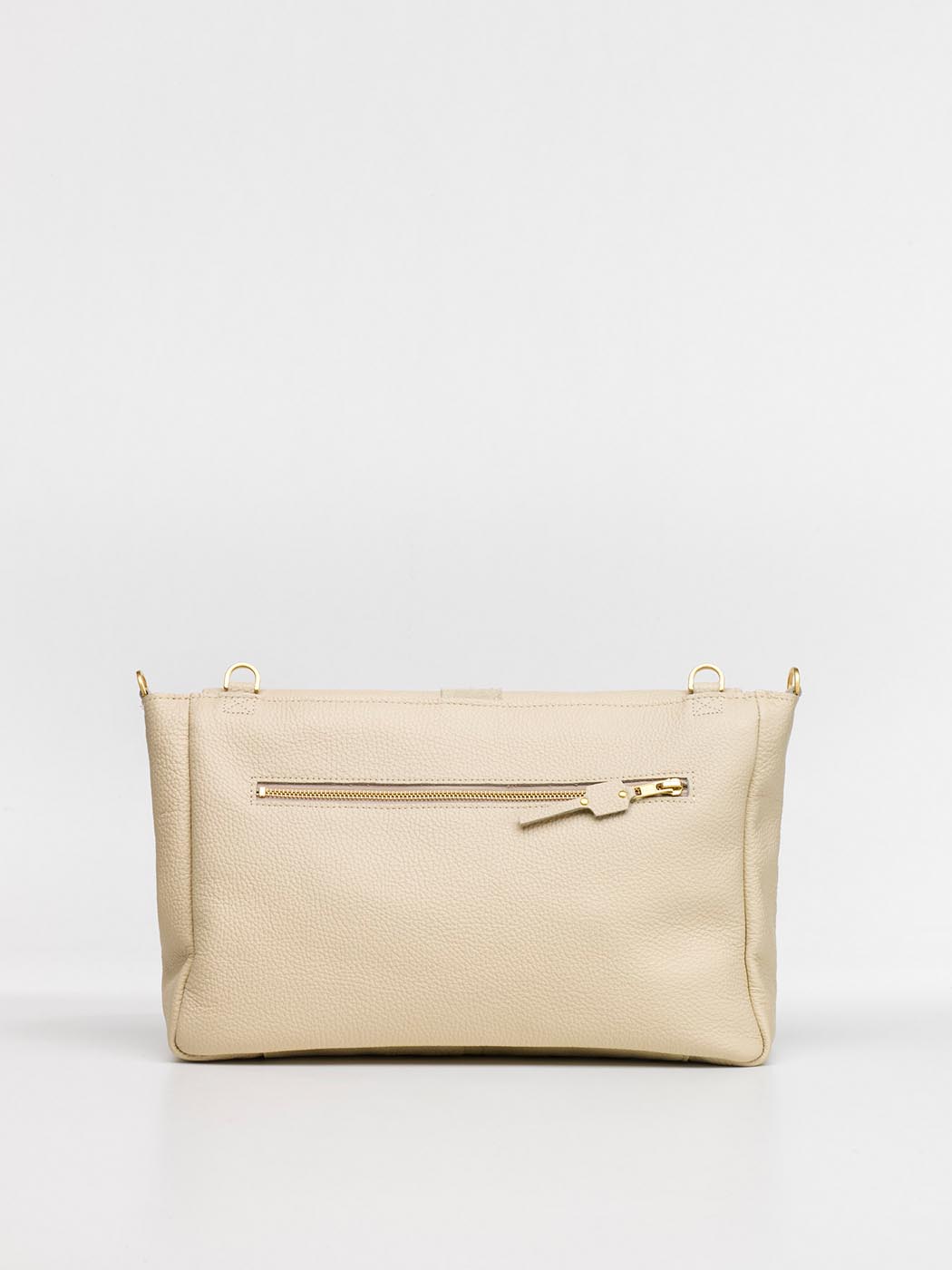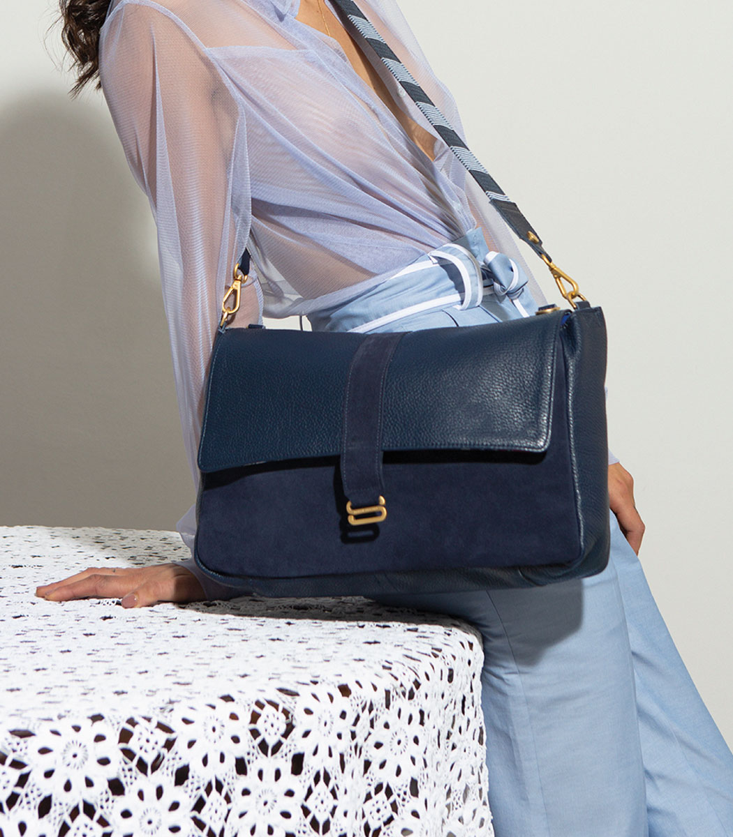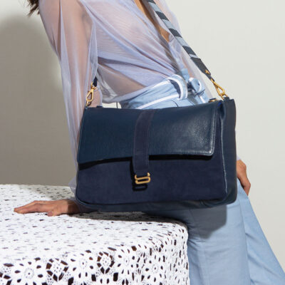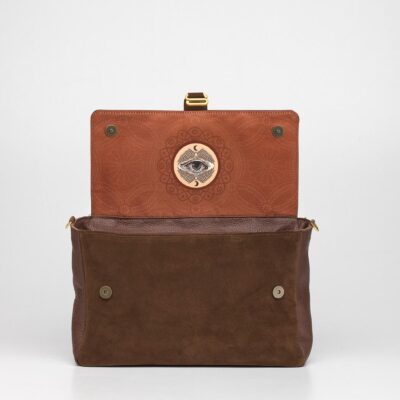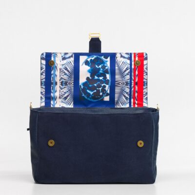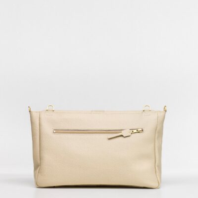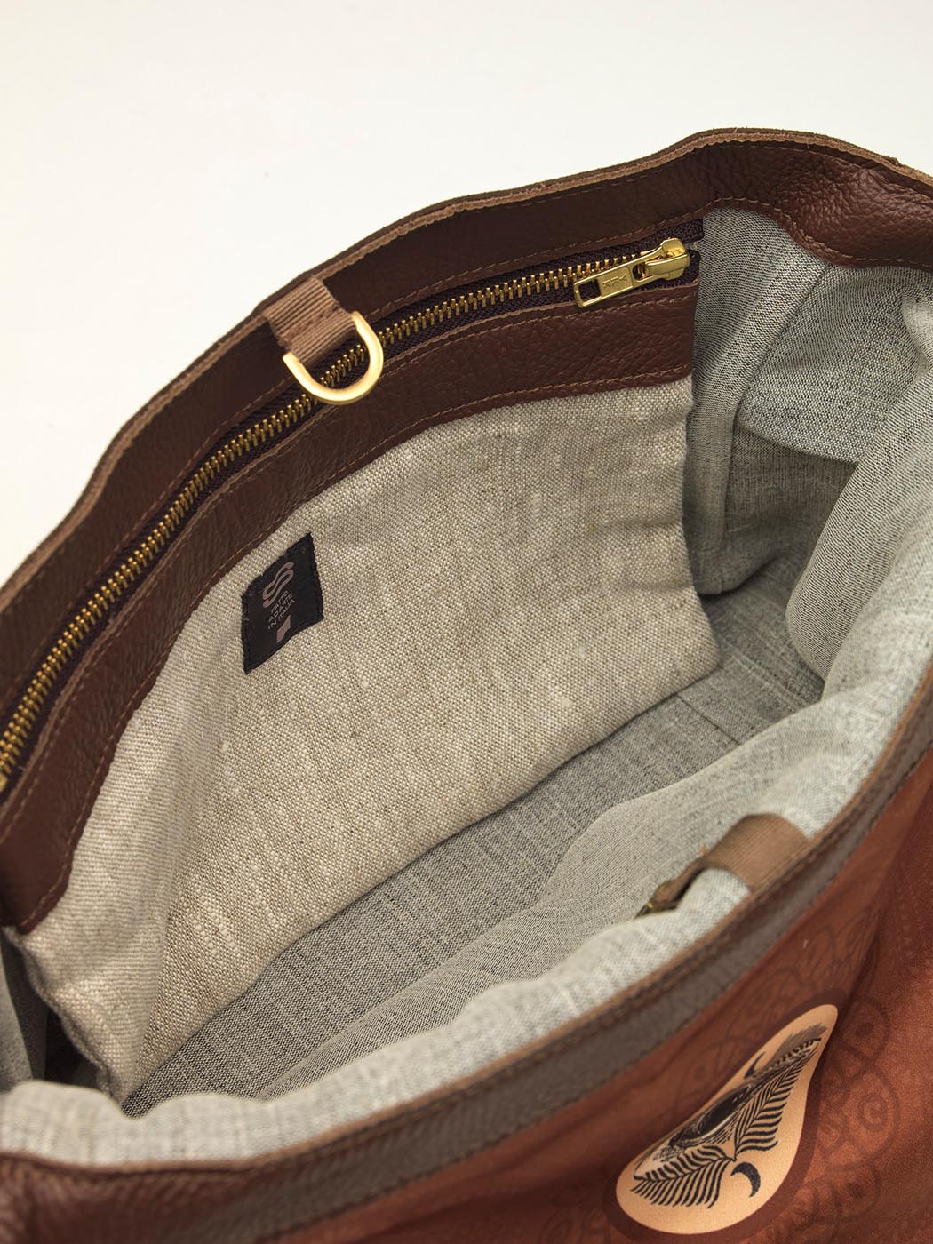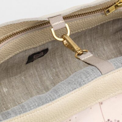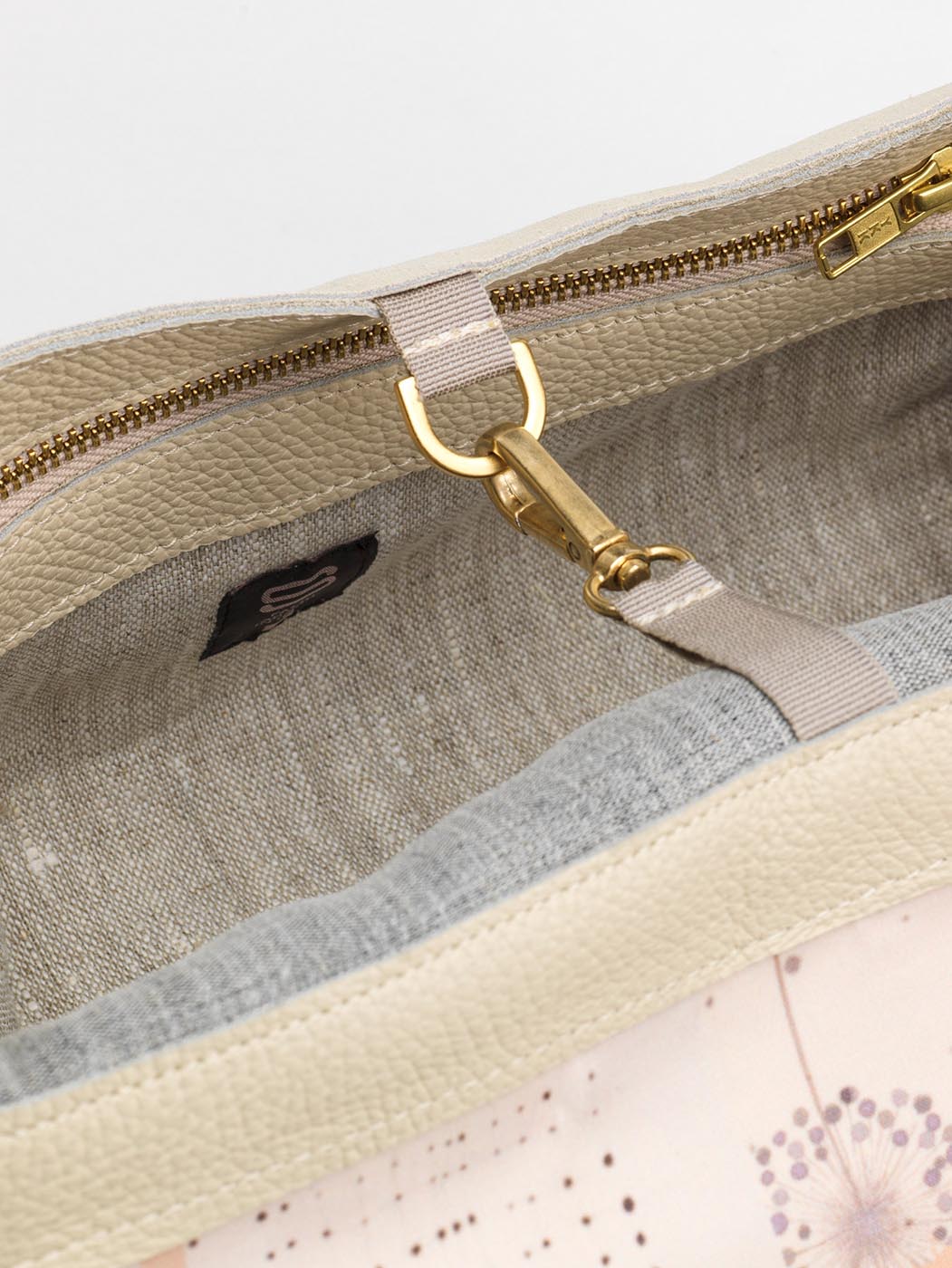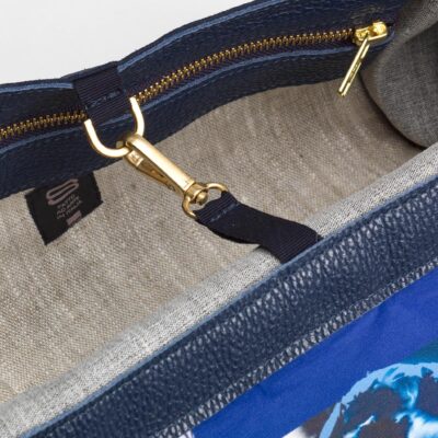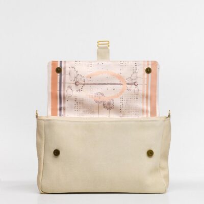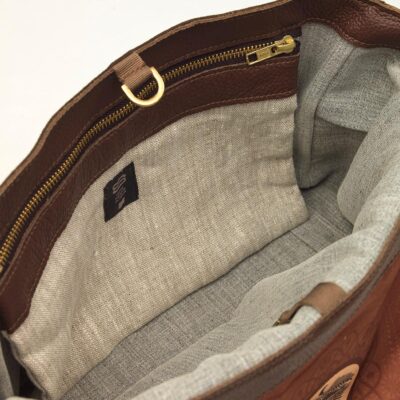 Allestimento interno: 2 profonde tasche, 1 interna e 1 esterna, sul retro, realizzate in lino tessuto a telaio, con chiusura zippata; fodera interna 100% cotone