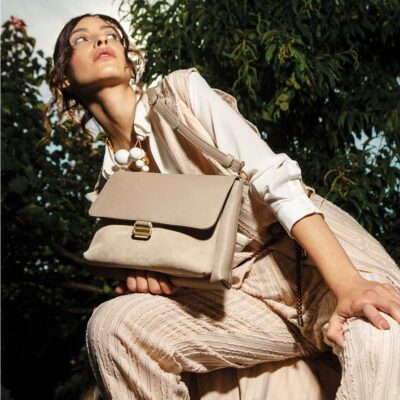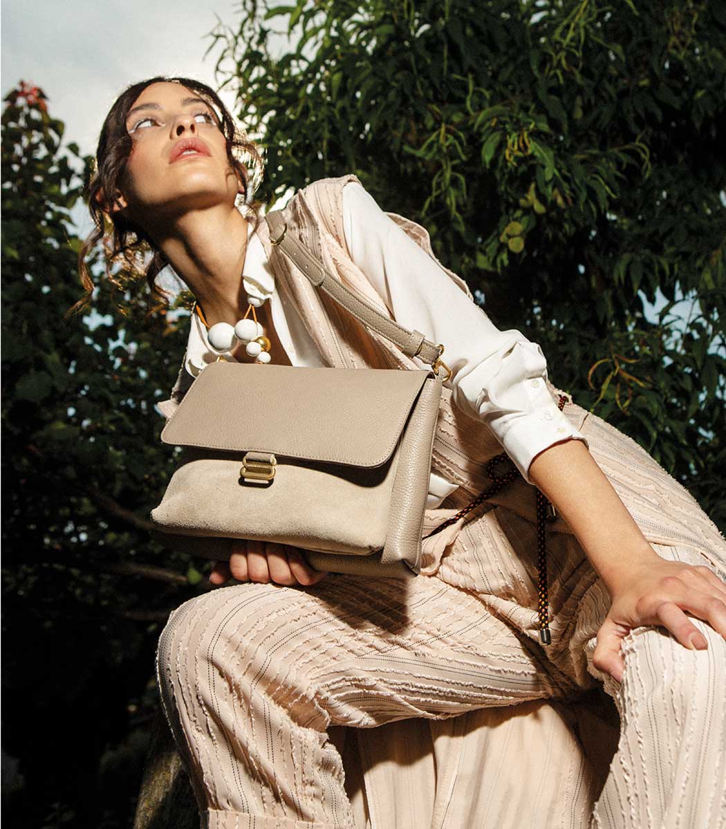 Borsa a tracolla da donna pratica e capiente, costituita da due corpi leggermente distanziati, realizzati rispettivamente in pelle martellata e in pelle scamosciata. Il corpo anteriore è chiuso da zip metallica. Patta in pelle stampa dollaro, foderata con illustrazioni limited edition. Chiusura lampo e moschettoni sono in ottone finitura oro opaco, con possibilità di cambiare la tracolla in pelle grazie alle tracolle opzionali di Maison Siccardi, in tessuto o in catena. Una borsa in pelle con cui Maison Siccardi raddoppia in bellezza per venire incontro a tutte quelle donne che amano coniugare femminilità e praticità.