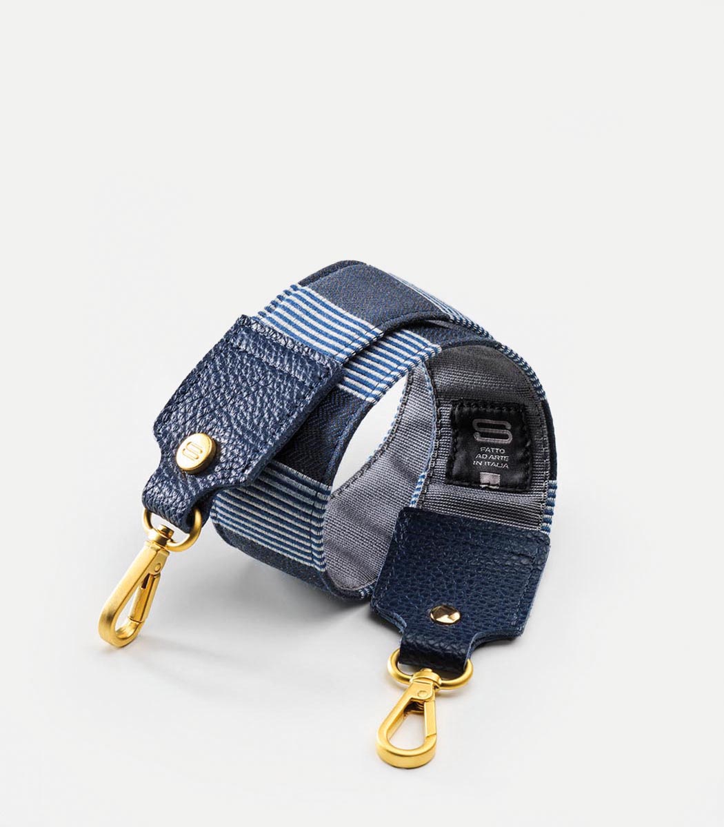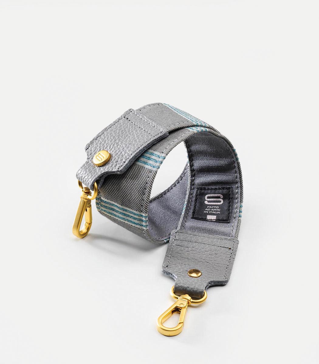 Tracolla in tessuto doppiata con gros grain effetto antiscivolo e rifinita con puntali in vera pelle. Realizzata con tessuti d’arredo limited edition e in pochi esemplari, in modo da garantire unicità alle vostre scelte. Borchie logate e moschettoni per il fissaggio al corpo della borsa sono in oro opaco. Disponibile in misure differenti sia per altezza che per larghezza.