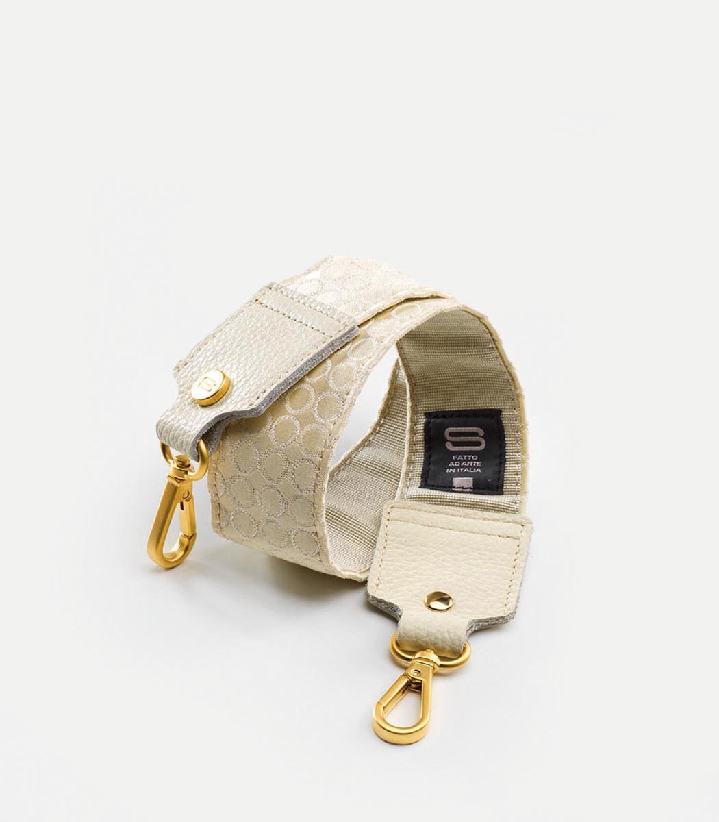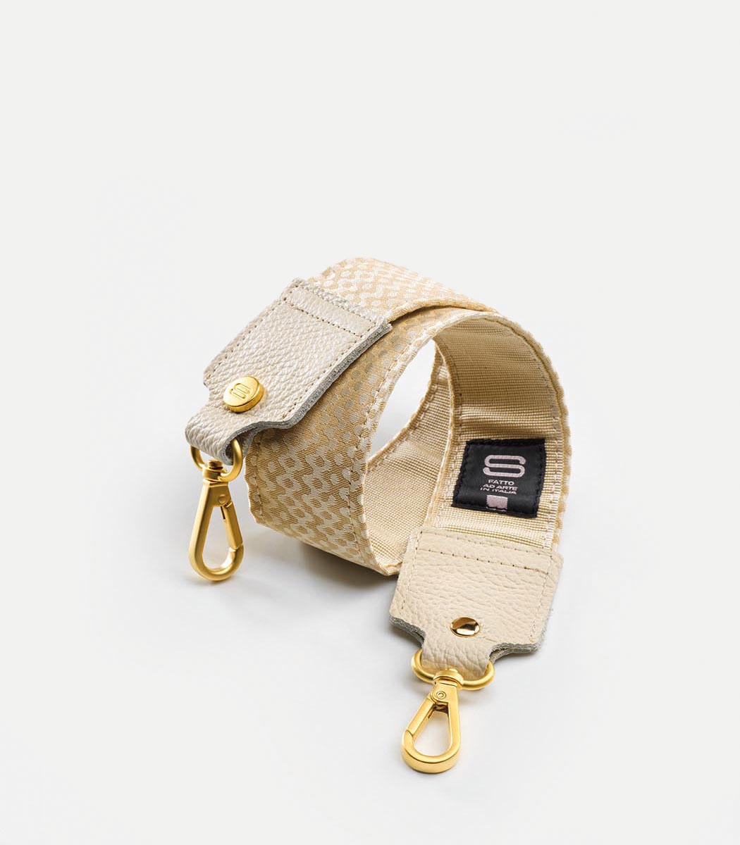 Tracolla in tessuto doppiata con gros grain effetto antiscivolo e rifinita con puntali in vera pelle. Realizzata con tessuti d’arredo limited edition e in pochi esemplari, in modo da garantire unicità alle vostre scelte. Borchie logate e moschettoni per il fissaggio al corpo della borsa sono in oro opaco. Disponibile in misure differenti sia per altezza che per larghezza.