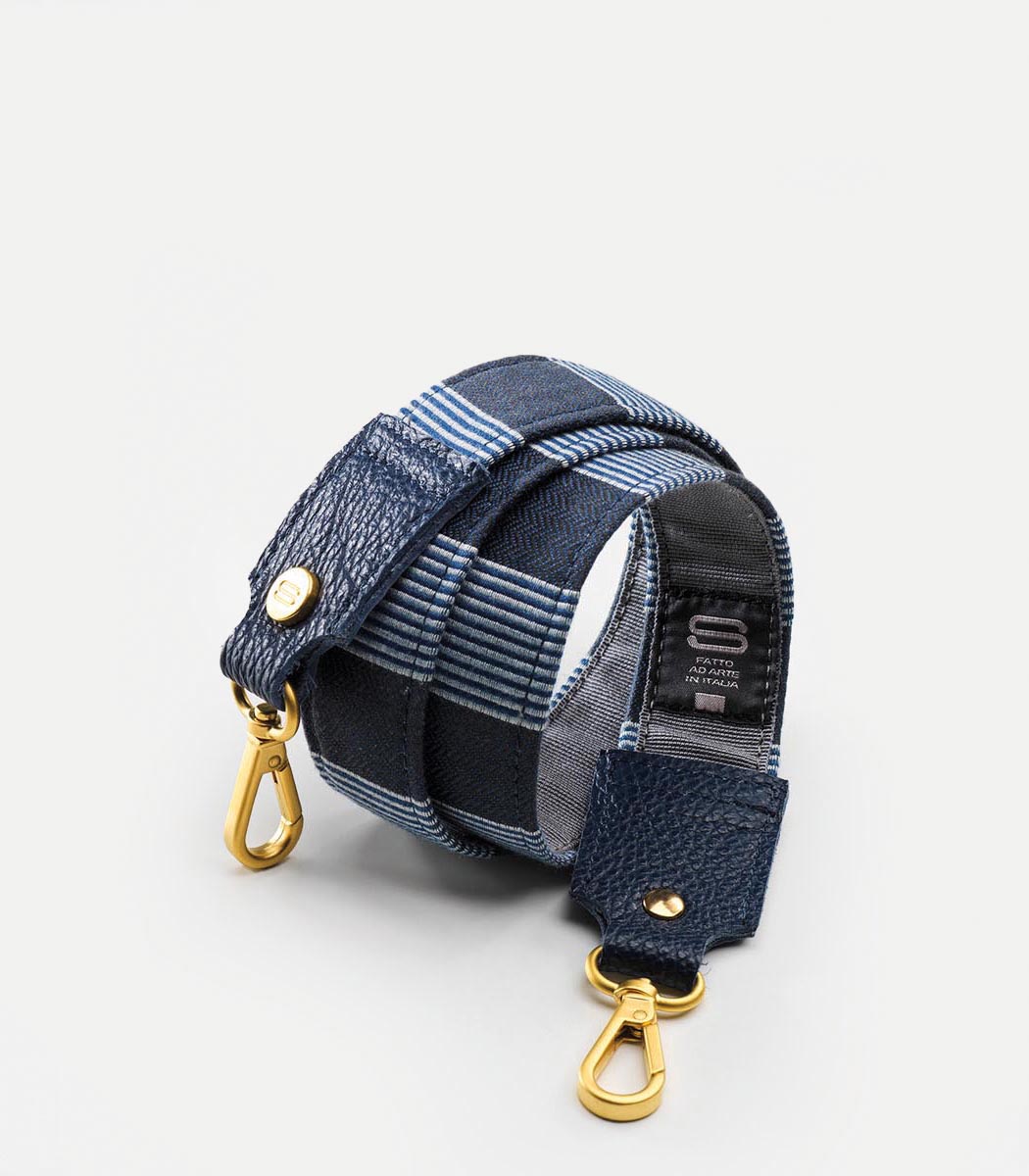 Tracolla in tessuto doppiata con gros grain effetto antiscivolo e rifinita con puntali in vera pelle. Realizzata con tessuti d’arredo limited edition e in pochi esemplari, in modo da garantire unicità alle vostre scelte. Borchie logate e moschettoni per il fissaggio al corpo della borsa sono in oro opaco. Disponibile in misure differenti sia per altezza che per larghezza.